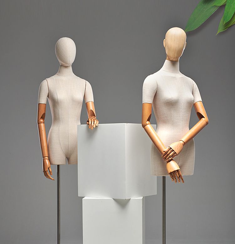 Женский манекен-торс, обтянутый тканью, с деревянными руками.