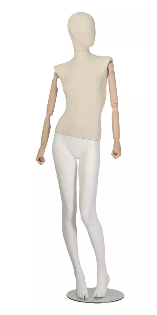 Женский манекен, обтянутый тканью, с деревянными руками \ VNG-06F – новая трендовая модель, торс и голова обтянуты тканью (светлый лен), шарнирные руки изготовлены из натурального дерева и имеют прочные металлические крепления. Руки и пальцы двигаются и фиксируются в любом положении. Голова поворачивается и снимается, за счет чего удобно переодевать, не растягивая одежду, предусмотрена заглушка для шеи (возможно использовать без головы). В комплекте два вида крепления – в голень и в стопу, можно использовать как в обуви так и без.
