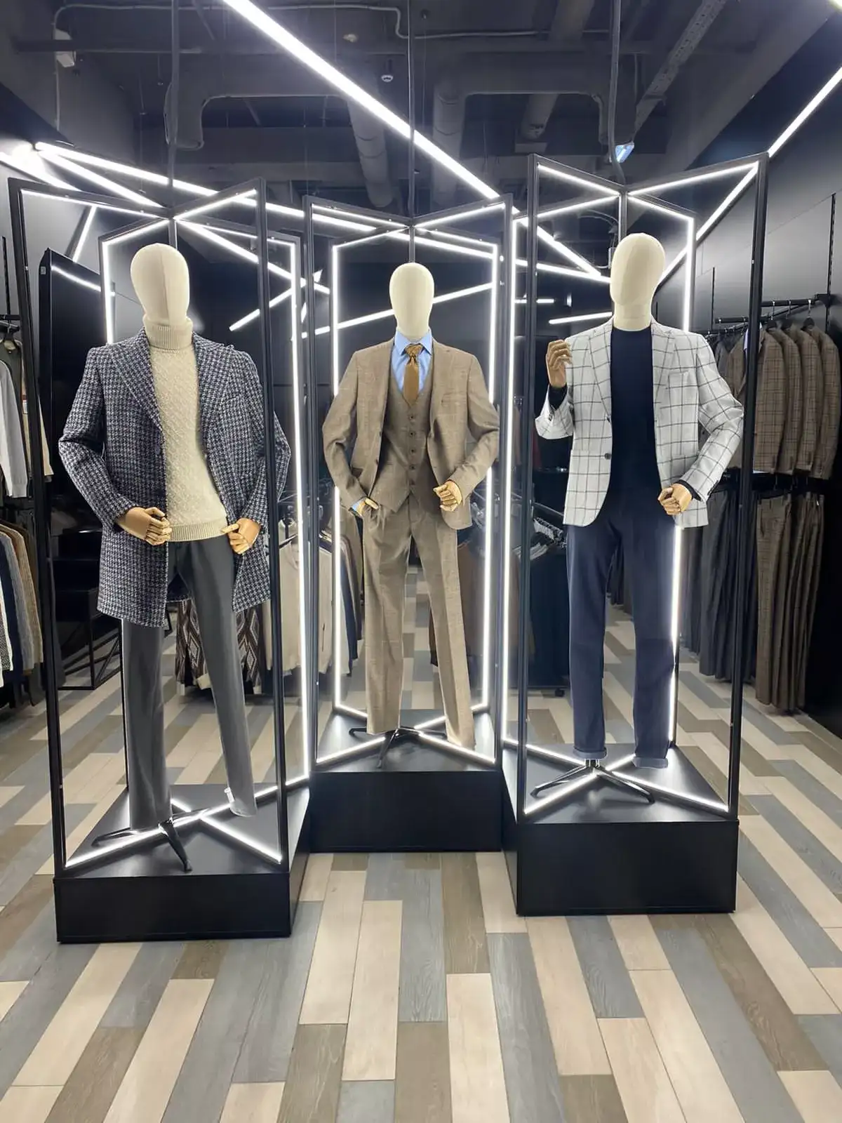 Магазин мужской одежды Faza обратился к нам за помощью в выборе манекенов для демонстрации мужской одежды. Выбор пал на абстрактные манекены с деревянными руками, на которых эффектно выглядят мужские костюмы вкупе с необычной подсветкой.
